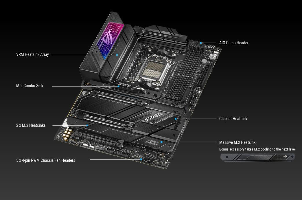 - Δύο παχιές ψύκτρες VRM συνδέονται μέσω ενός σωλήνα θερμότητας, μοιράζοντας την ικανότητα ψύξης μεταξύ των VRM και παρέχοντας άφθονη επιφάνεια και μάζα για την αντιμετώπιση των αναγκών ισχύος των επεξεργαστών υψηλής απόδοσης AMD Ryzen™ 7000 Series.