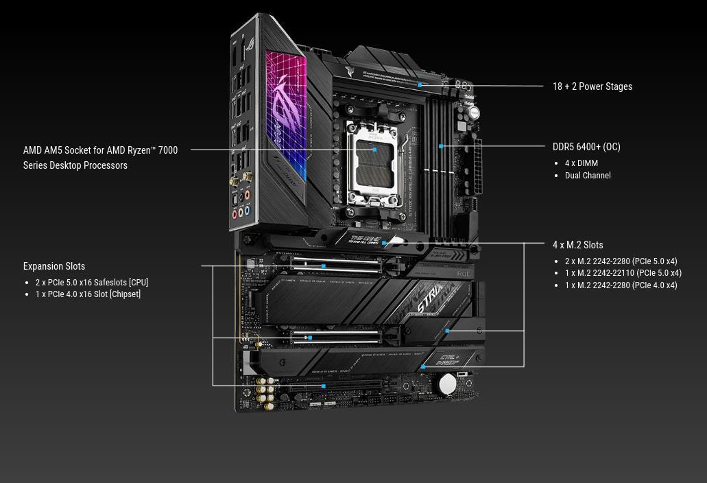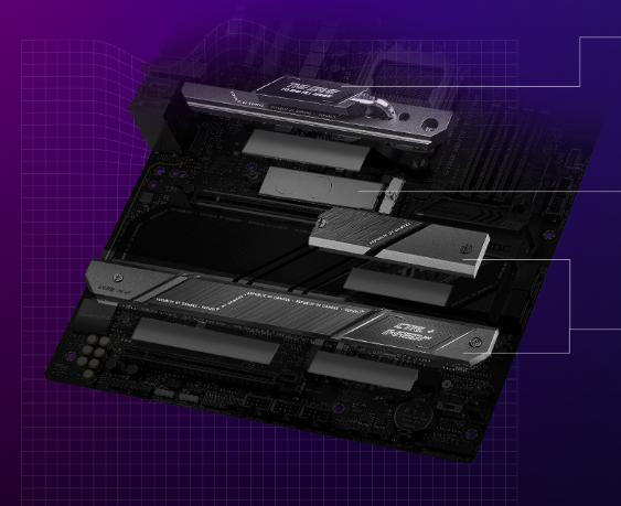 Η ταχύτατη αποθήκευση είναι στη διάθεσή σας με τρεις υποδοχές PCIE 5.0 M.2 και μία υποδοχή PCIE 4.0 M.2. Ανεβάστε τις ταχύτητες ακόμη περισσότερο, δημιουργήστε ένα αντίγραφο ασφαλείας με καθρέφτη ή και τα δύο. Διαμορφώσεις RAID NVMe και SATA (0/1/10) είναι διαθέσιμες μέσω του AMD RAID Xpert2. Η υποστήριξη PCIe 5.0 επεκτείνεται επίσης σε δύο υποδοχές επέκτασης x16, οι οποίες περιλαμβάνουν SafeSlot για την υποστήριξη βαρέων καρτών γραφικών και Q-release (μόνο στην επάνω υποδοχή) για εύκολη αναβάθμιση.