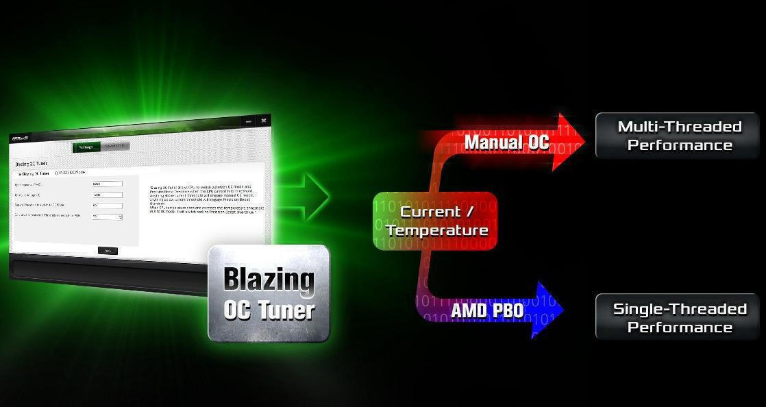 Το Blazing OC tuner επιτρέπει στη CPU AM5 να εναλλάσσεται μεταξύ της λειτουργίας OC και της λειτουργίας PBO (Precision Boost Overdrive) όταν το ρεύμα της CPU φτάσει στο όριο. Οτιδήποτε βρίσκεται πάνω από το τρέχον όριο θα ενεργοποιήσει τη χειροκίνητη λειτουργία OC, αν βρίσκεται κάτω από το τρέχον όριο, τότε θα ενεργοποιήσει τη λειτουργία Precision Boost Overdrive. Αυτή η ιδέα είναι να συνδυάσετε το overclocking σε όλους τους πυρήνες και την αυτόματη ώθηση σε έναν πυρήνα για να επιτύχετε την καλύτερη δυνατή απόδοση της CPU σας. Δεν χρειάζεται να εισέλθετε στο BIOS για τη ρύθμιση, μπορείτε να τροποποιήσετε όλες τις ρυθμίσεις εγκαίρως κάτω από το λειτουργικό σύστημα.