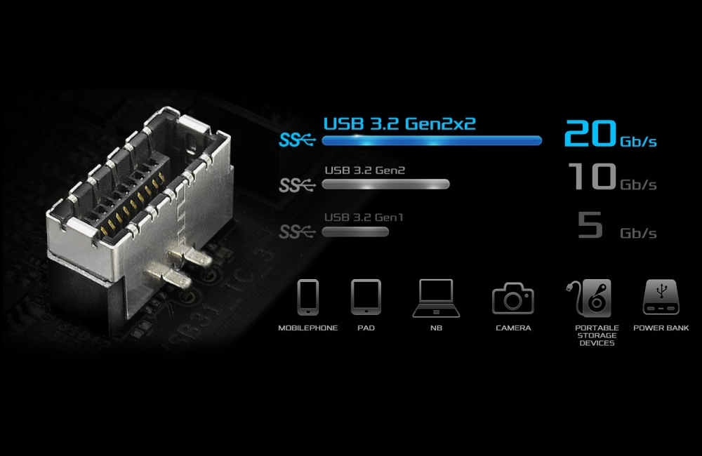Η τελευταία έκδοση USB 3.2 Gen2x2 Type-C παρέχει ρυθμό μεταφοράς δεδομένων έως και 20 Gbps, ο οποίος είναι 2 φορές ταχύτερος από την προηγούμενη γενιά, παρέχοντας μια ταχύτατη διασύνδεση μεταφοράς δεδομένων με αναστρέψιμο σχεδιασμό USB Type-C που προσαρμόζει τον σύνδεσμο με οποιονδήποτε τρόπο.